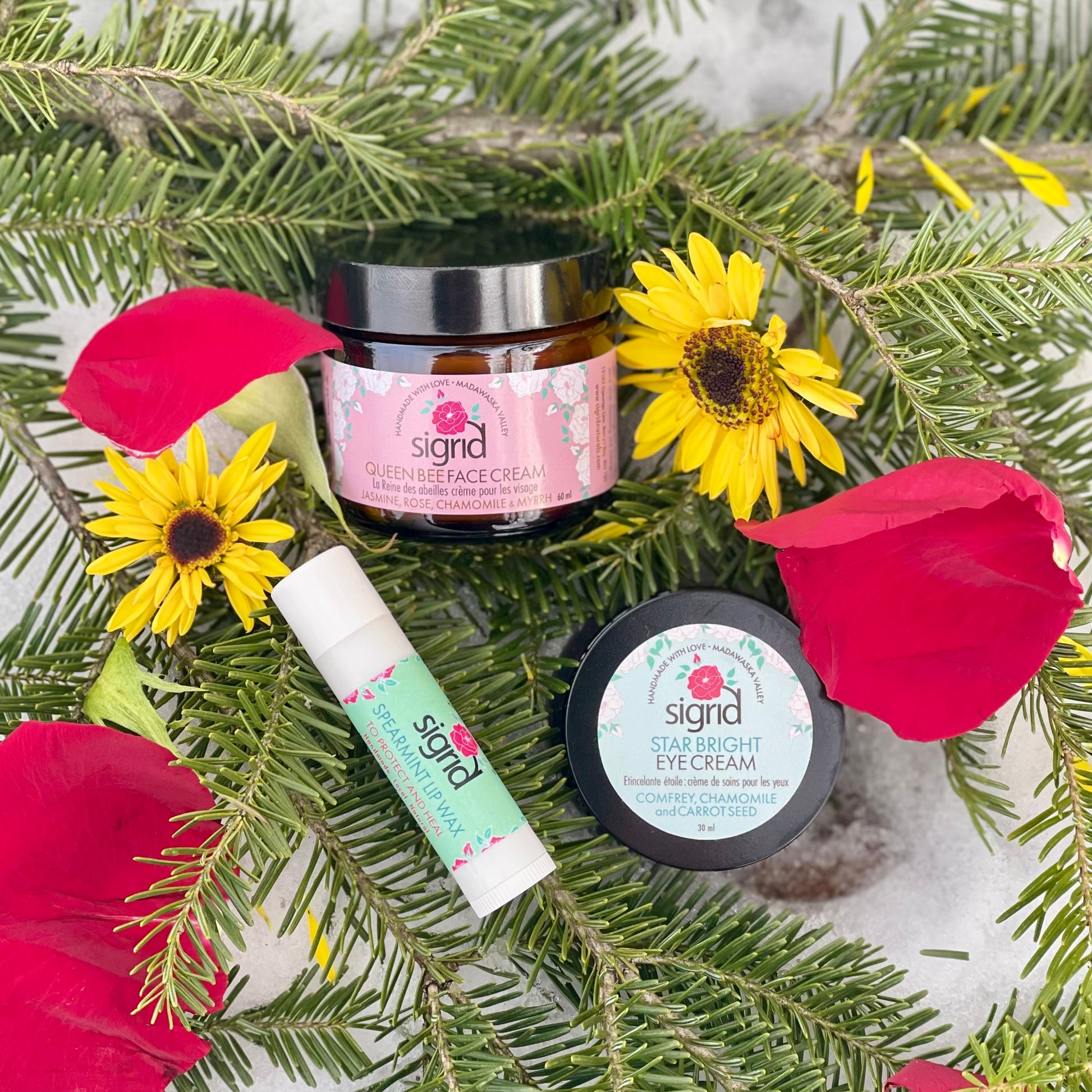 The Queen Collection includes Queen Bee Face Cream, Star Bright Eye Cream, and Spearmint Lip Wax.