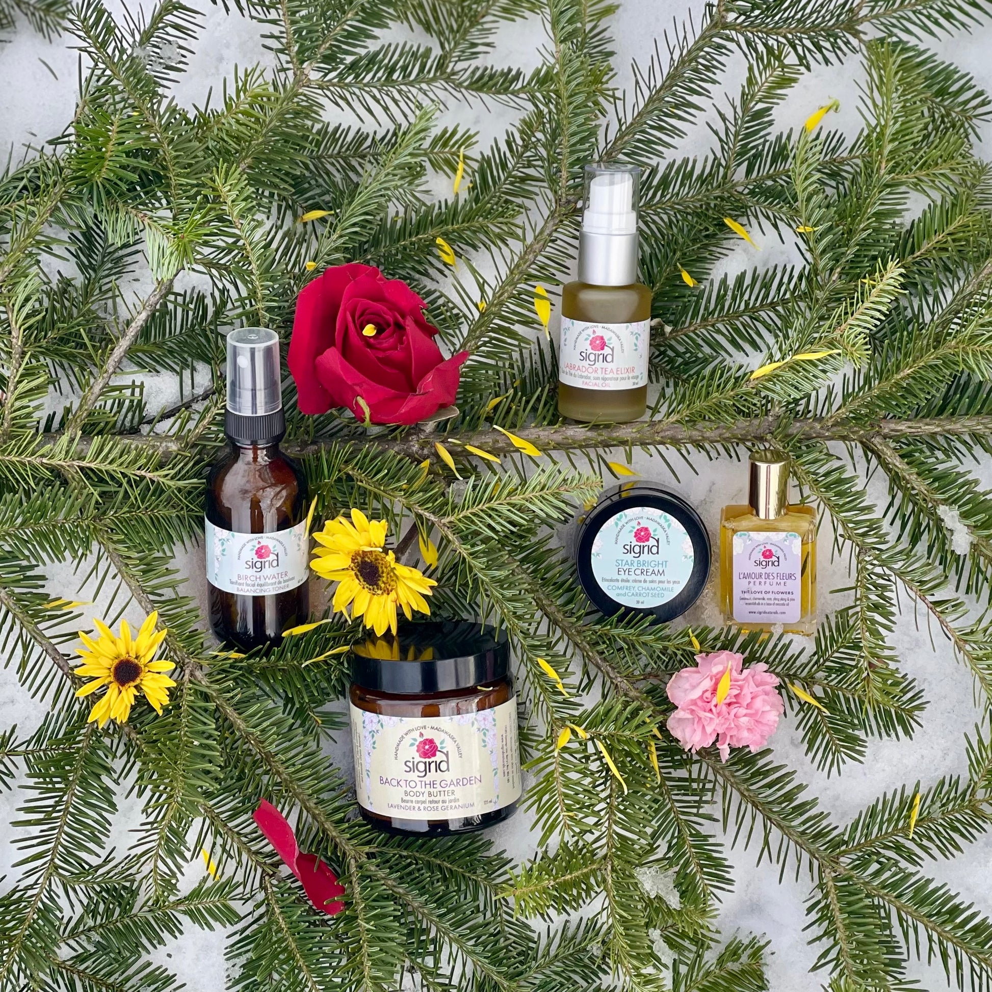The Dreamer includes the following of our dreamy products: Back to the Garden Body Butter, Star Bright Eye Cream, L'Amour des Fleurs Perfume, Labrador Tea Facial Elixer, and Birch Water Balancing Toner.